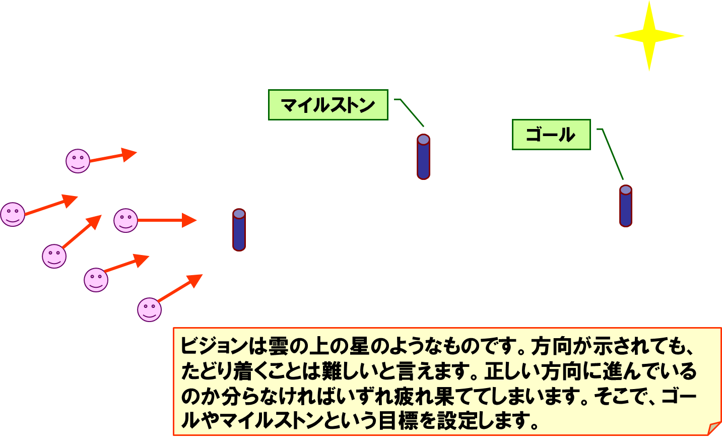 チーム全員で、プロジェクトの構想・目的、利害関係者、目標を共有します。 チームで議論を重ねて、「なぜ」「何を」「誰のために」「いつまでに」「どのくらい」開発するのかを合意します。 チームは、自分たちで合意する過程を通してプロジェクトに対するモチベーションが高まります。 合意した結果をプロジェクトマニフェストとして簡潔にまとめ、プロジェクトルームに掲示して、いつでもふりかえって確認できるようにします。 SRAは、プロジェクトマニフェスト作成のためのファシリテーションを支援します。